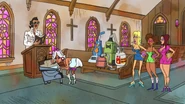 Wesley and Besley return home to tell their parents, Leslie and Presley, about their day - they shaved the cows, shot all the rabid dogs, collected dust for coffee, and said their anti-witch prayers. Leslie erroneously calls her human child by the name "Besley" and the robot corrects her, saying that he's actually Besley. Leslie laughs and admits that she can never tell her twins apart. She is excited to tell the boys that tomorrow will be their baptism, a preliminary stepping stone to getting the two into Heaven.